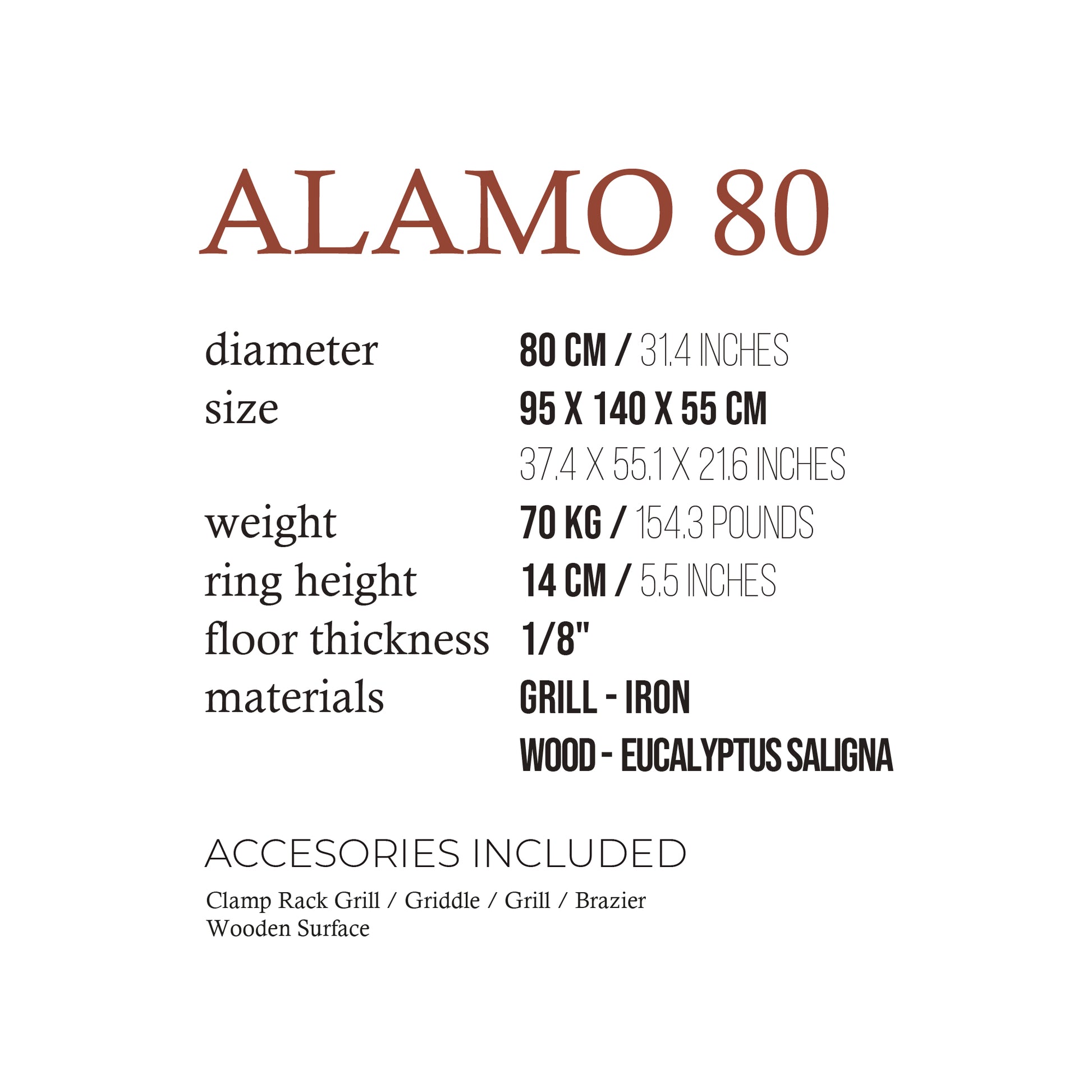 PETIT ALAMO 80 Rust by Fogues TX is a rustic-style medium-size grill that combines traditional aesthetics with portability. Its natural rust patina enhances over time, making it perfect for countryside or backyard cooking with an authentic touch.